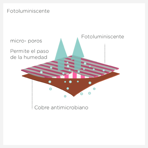 Tecnología que permite que el textil sea altamente visible para brindar más seguridad al usuario, cargando durante 6 horas su luminiscidad, complementando el control de la proliferación de bacterias.